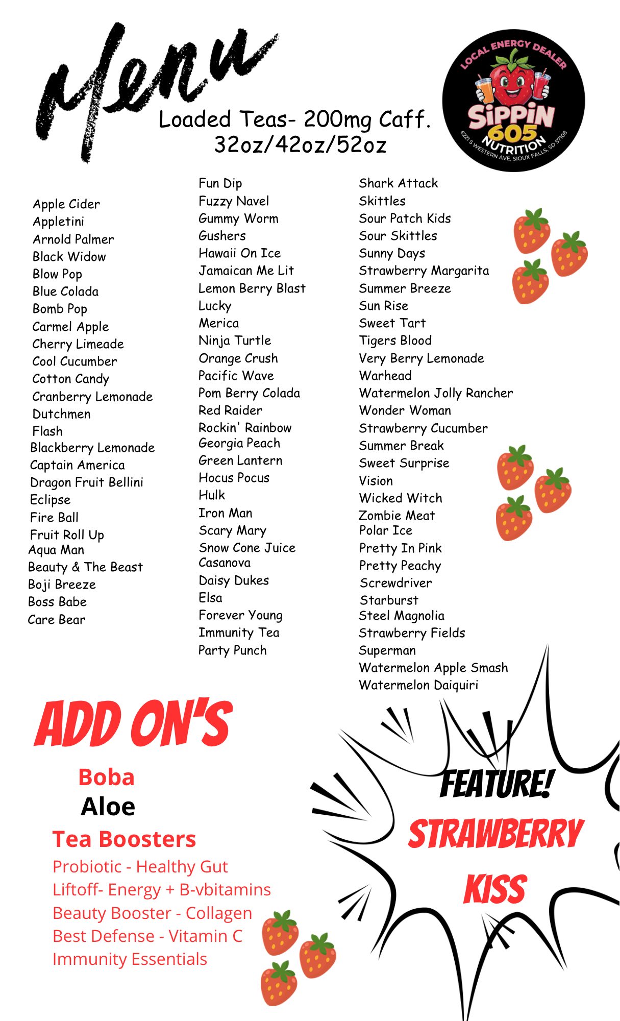 Sippin 605 Nutrition is your go-to health food store in Sioux Falls, SD. We offer a diverse selection of nutritious shakes and teas crafted to support a healthy lifestyle. At Sippin 605 Nutrition, we believe that maintaining wellness can be both enjoyable and convenient. We provide tasty meal replacement options and energy-boosting drinks. Our focus is on offering delicious and health-conscious choices. We customize our offerings to assist everyone reach their personal health ambitions. Stop by and explore how our beverages can complement your daily routine!
